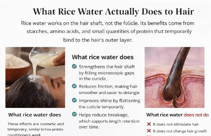 Rice water is a cosmetic conditioning treatment, not a biological growth solution.